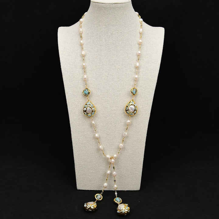 GG Cultured White Keshi Pearl Larimar Blue Murano Glass Long Rosary Mix color CZ Chain Necklace Simple Lady Gifts