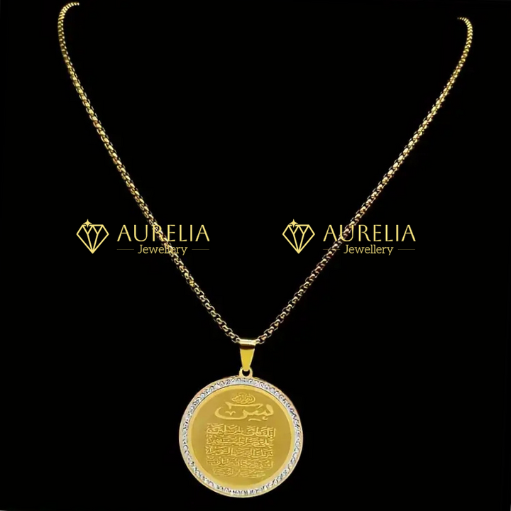 Golden-Toned Stainless Steel Islamic Amulet Necklace with Arabic Quranic Verse Pendant - Unisex Fashion Jewelry, Intricate Biblical Design with Rhinestone Accents, Perfect for Daily Wear or Gifting, Islamic Jewelr