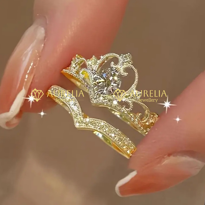 Elegant Crown Princess-Inspired Rhinestone Ring Set, Adjustable Open-End Rings, Alloy Base with Plating, Cute Occasion Jewelry 2-Piece Set