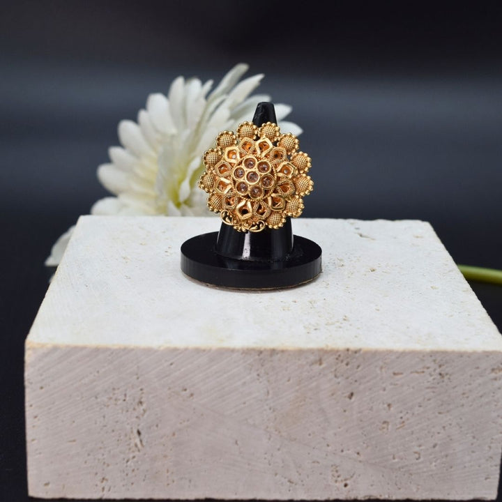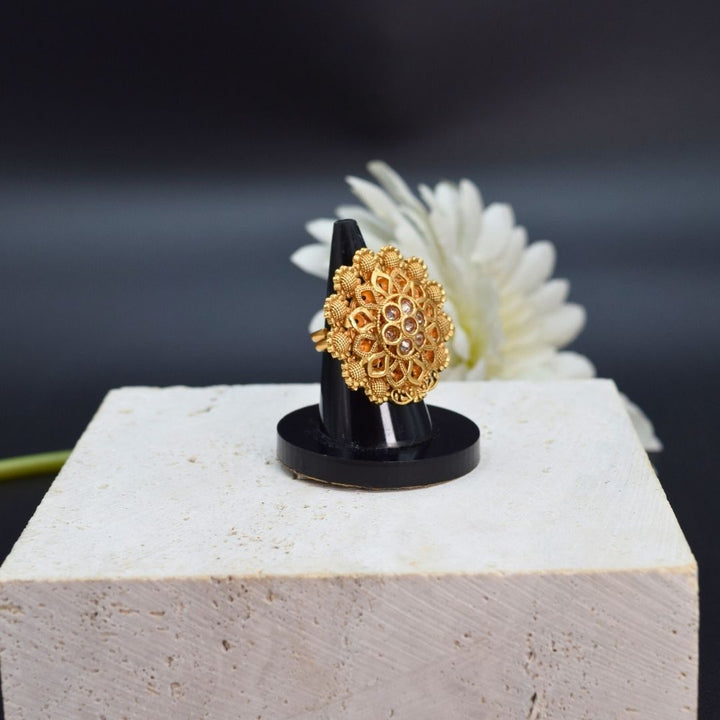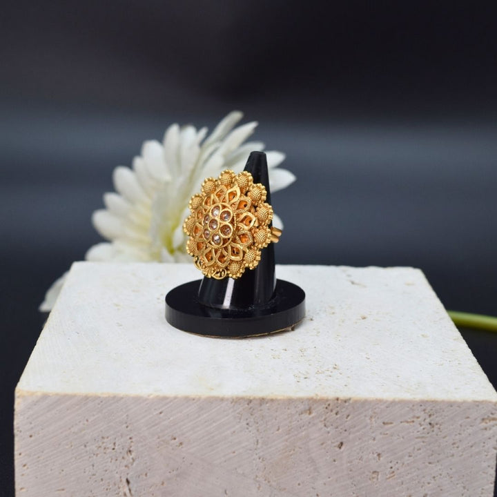 This beautiful, adjustable ring features traditional Kundan stones in a graceful design. It's the perfect accessory to add a touch of timeless elegance to any look. Since it's adjustable, you'll always have a comfortable, perfect fit