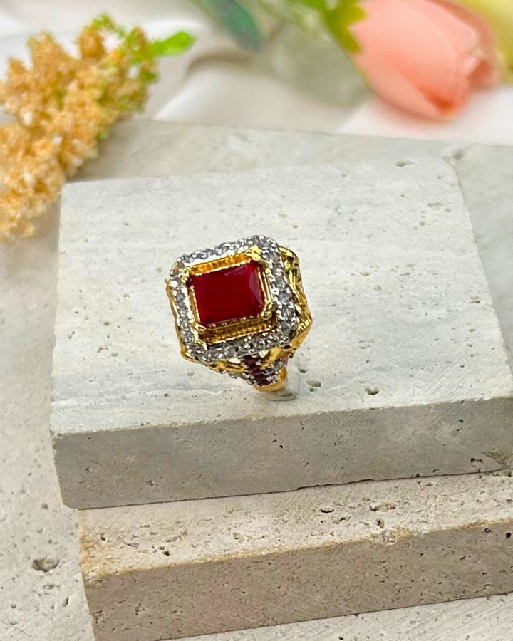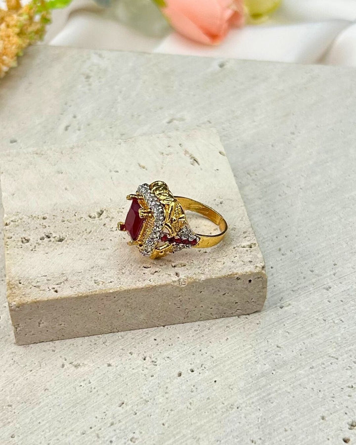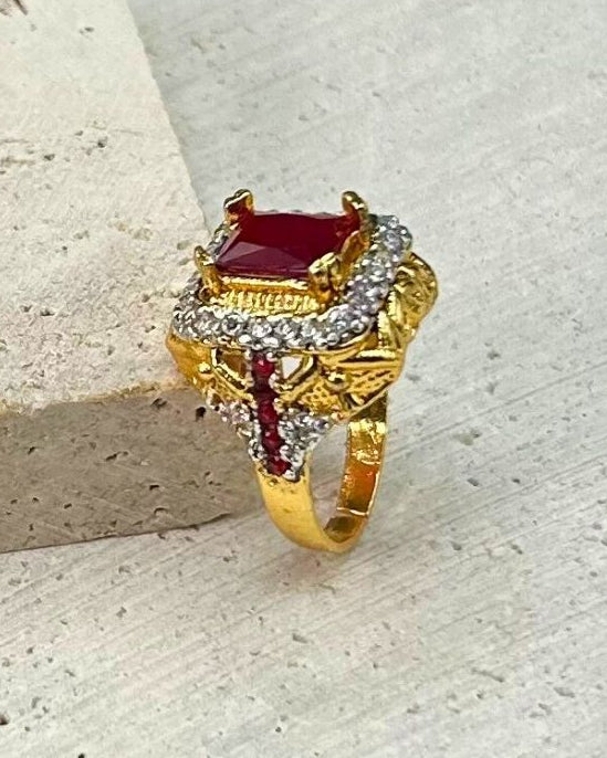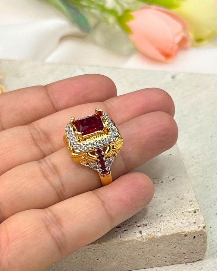 Add a touch of glamour with this stunning ruby red cocktail ring. Crafted with precision stone work on metal, this single piece exudes elegance and sophistication. Make a statement with this bold and vibrant accessory that effortlessly elevates any outfit. Perfect for a night out or special occasions. Brand: Aurelia.Pk.