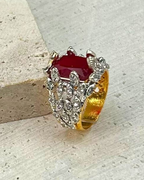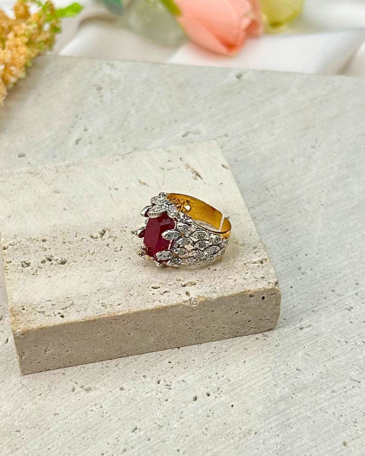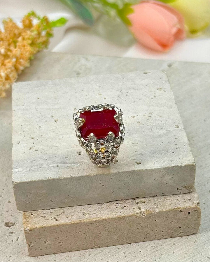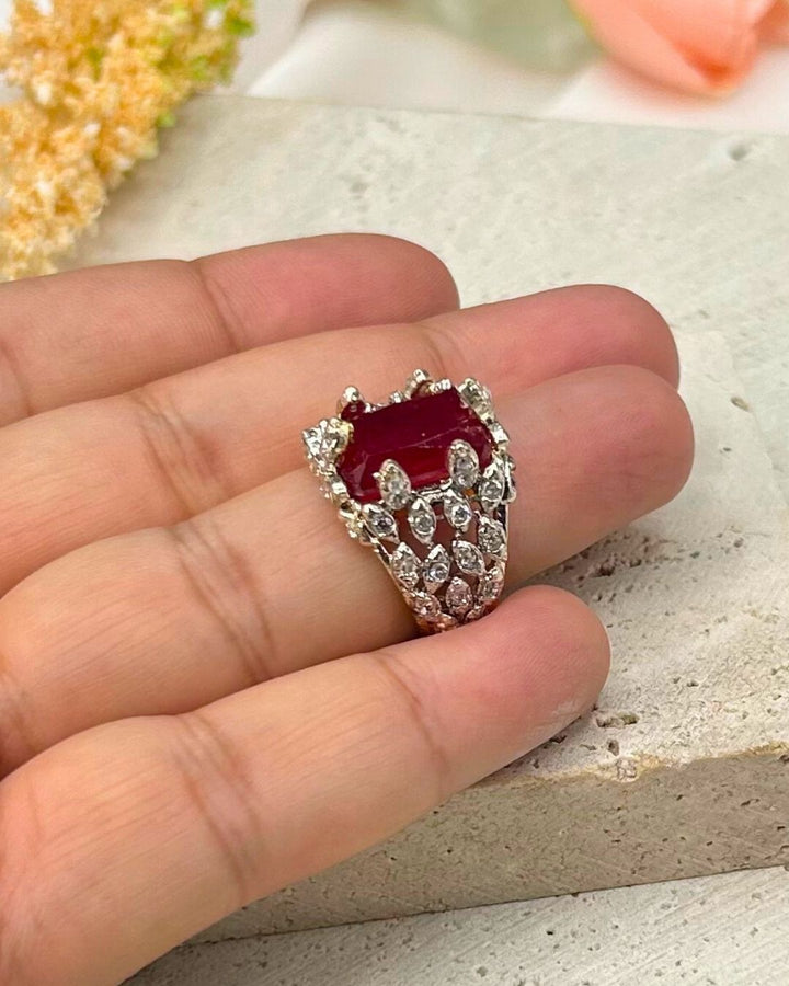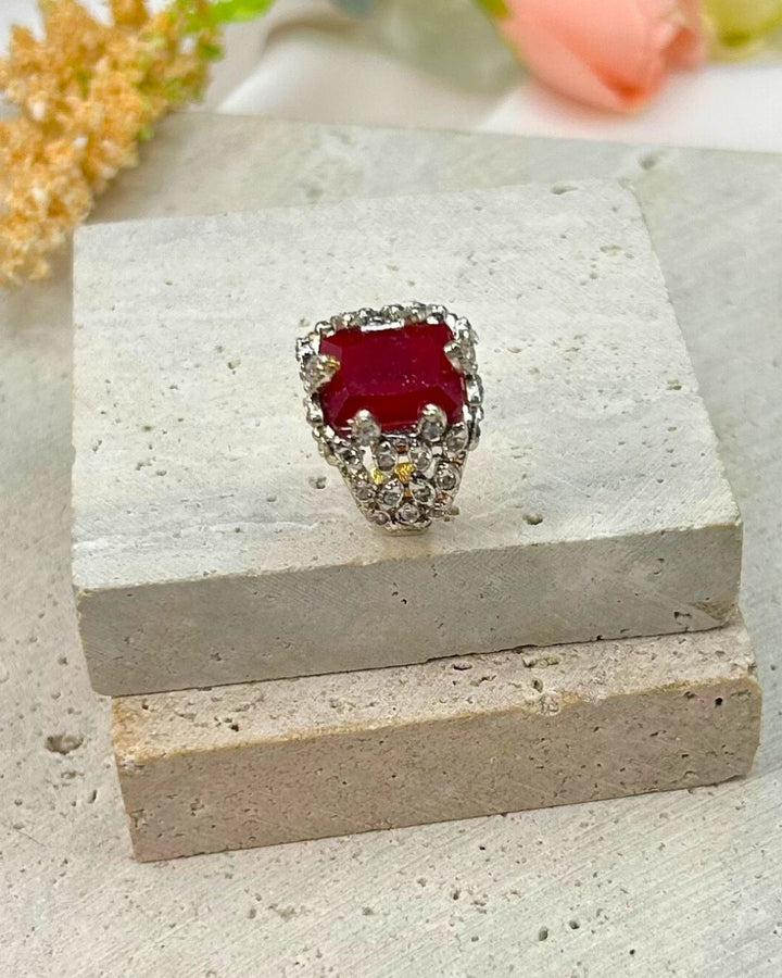 This statement-worthy ruby red cocktail ring features intricate stone work on metal, making it a bold and elegant accessory. Perfect for adding a pop of color to any outfit, this stunning piece is a must-have for those who adore unique jewelry. Elevate your look with this exquisite ring from Aurelia.Pk.