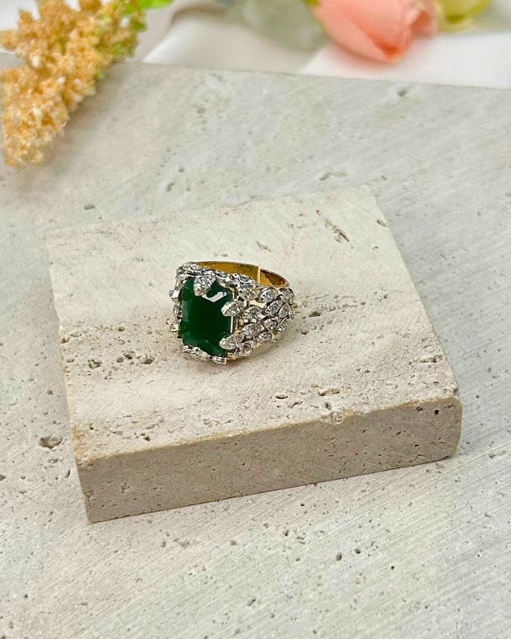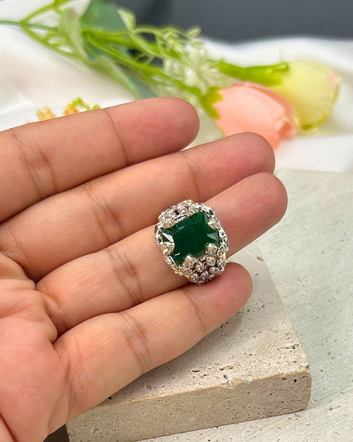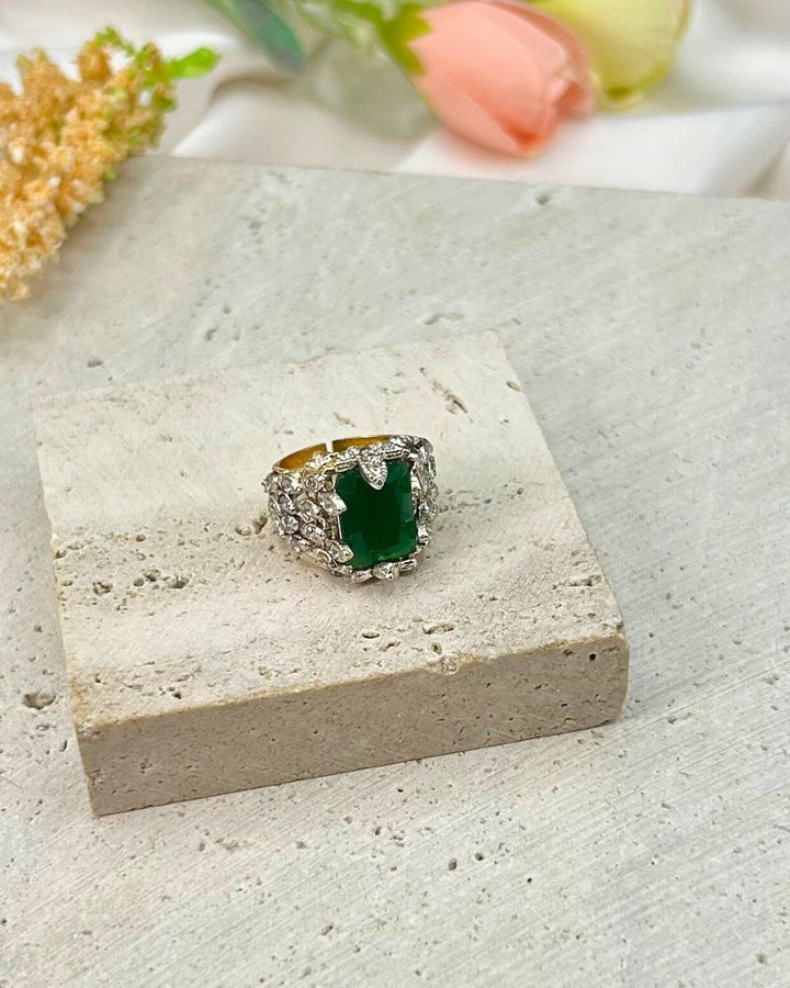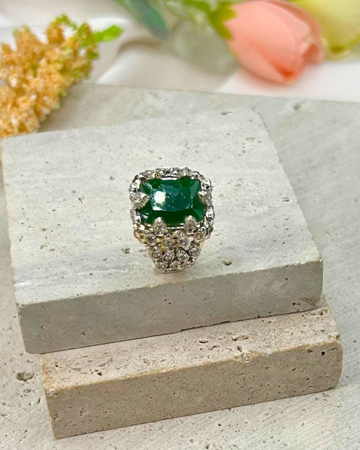 Indulge in the allure of this captivating emerald green cocktail ring, crafted with meticulous stone work on a sleek metal base. The vibrant hue and intricate design make this piece a show-stopping accessory, perfect for adding a touch of glamour to any outfit. Elevate your look with this stunning and uniquely crafted ring from Aurelia.Pk.