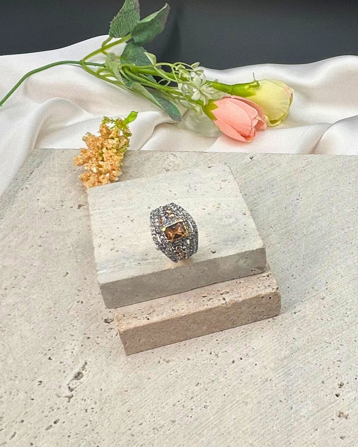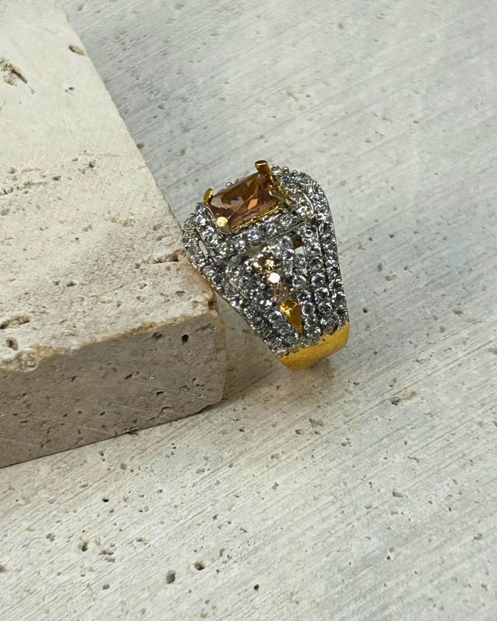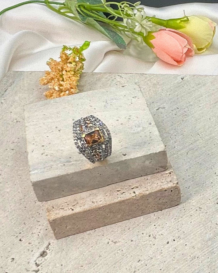 This halo ring in champagne color exudes a stunning elegance with intricate stone work. Crafted from metal, this one-piece accessory is a true showstopper, perfect for adding a touch of glamour to any outfit. Elevate your jewelry collection with this timeless piece from Aurelia.Pk.