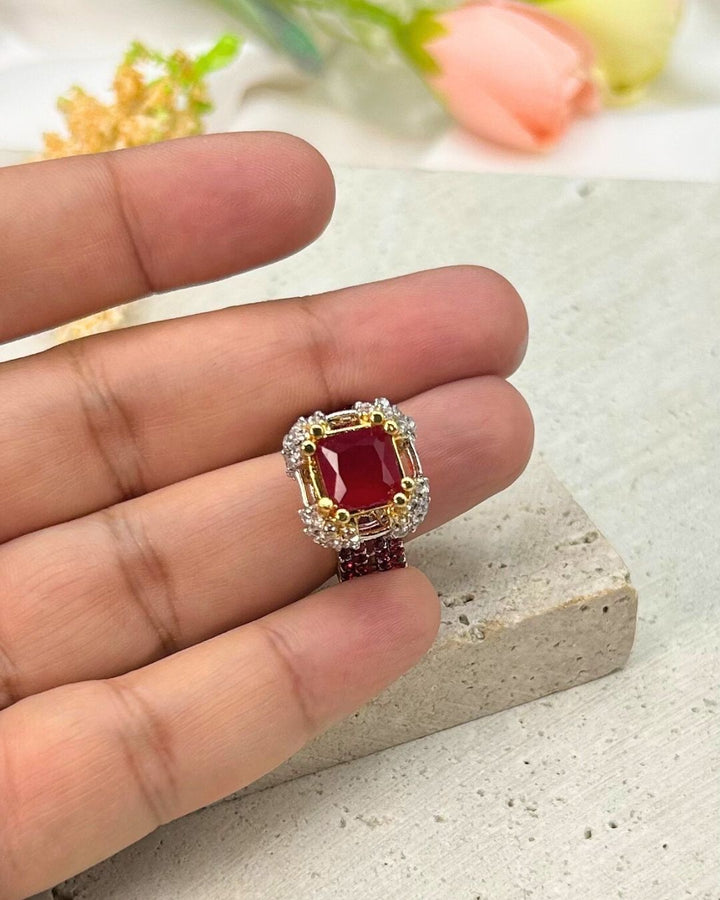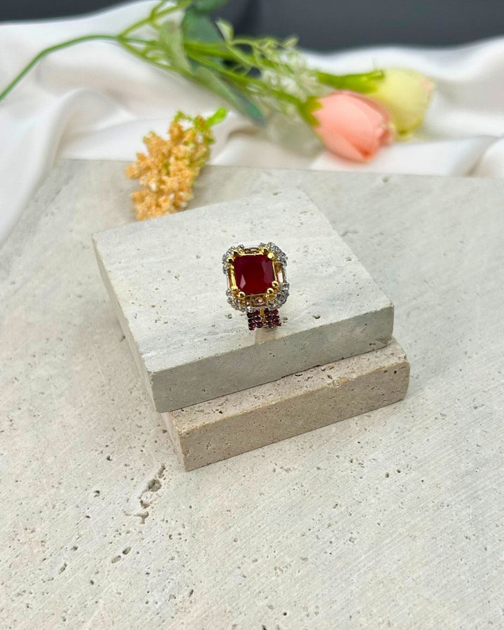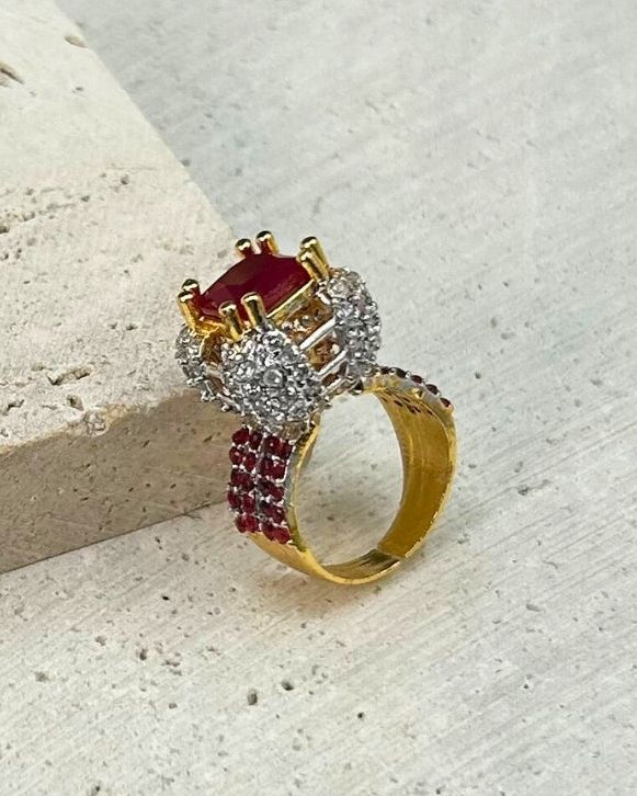 Make a regal statement with this ruby red Crown ring, expertly crafted with intricate stone work on metal. The stunning ruby red hue adds a touch of glamour, while the crown design exudes royalty and elegance. Perfect for adding a touch of sophistication to any outfit.