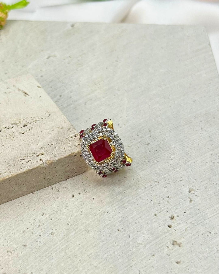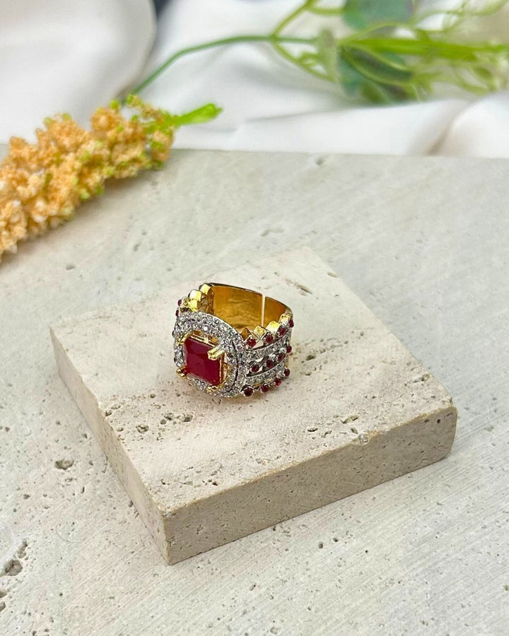 This statement-worthy cocktail ring in ruby red exudes elegance and sophistication with its intricate stone work design. Crafted from metal, this bold piece is a must-have for any jewelry collection, adding a touch of glamour to any outfit.